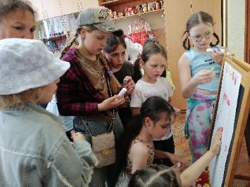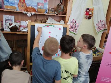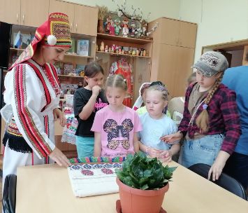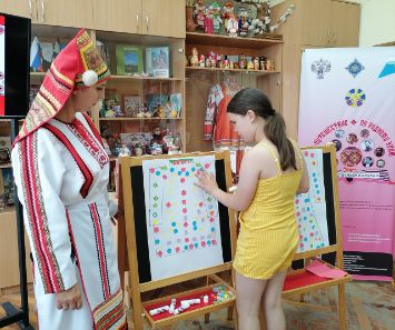 Перед тем как украсить платье (паля) мордовочки и рубашку (панар) мордовского парня, дети изучили орнаменты на аутентичных экспонатах (национальных костюмах, полотенцах, платках, подзорах) библиотечного мини-музея.